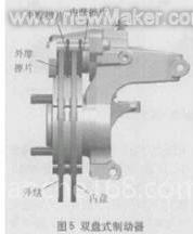增加制动力矩就是增加汽车的安全系数,增加制动力矩的研究已不限于常规影响制动力矩的几个主要因素。目前国外已经出现了滑动双盘式制动器(图5)。