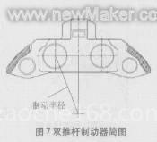 考虑到国内铸造工艺和材料水平,结合国外先进产品结构进行改进。通过单推杆改双推杆,增大加力面积,改善压应力不均匀性,同时增加制动半径(图7),实际设计产品制动半径达到173mm。重新设计压力臂和压力比,控制制动输入力。根据理论计算输入力,协调摩擦片厂家,设计合理的摩擦片成分。