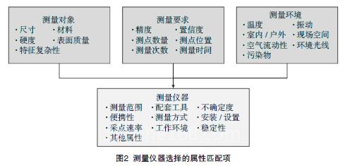 测量仪器选择是测量工艺规划的重要步骤之一,也是测量工艺资源配备的主要内容。测量仪器的选择配套方案直接影响到后续测量方案的制定。合理的测量仪器对测量精度、测量效率有重要的影响。仪器的选取目标是选择测量能力满足要求且整体性能最佳的仪器或仪器组合。测量约束条件与仪器性能指标匹配所包含的主要因素如图2所示。通过在测量仪器库的支持下,调用可测量性分析算法,通过测量对象、测量要求和测量环境三方面的约束条件与测量仪器库中仪器各项性能参数的匹配,计算待选仪器各项属性匹配相似度值的加权总和,然后依据该值选择测量能力满足要求且整体性能最佳的仪器,实现测量仪器选择功能。