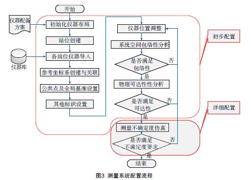 为完成具体测量任务对多台相同或不同测量仪器进行组合的技术,称为测量系统配置,它是大尺寸测量中的核心和关键问题[1-2]。易用、精确和快速的测量系统配置是大型零部件测量中的一个紧迫技术需求,已经成为一种必然的发展趋势[3]。测量系统配置的流程如图3所示,首先构建测量网络,然后通过测量系统初步配置以保证产品的可测量性,最后以测量不确定度为指标进行测量系统的详细配置[4]。