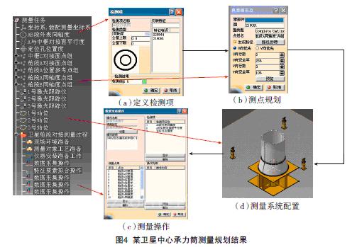 以某型号卫星中心承力筒组装测量为实例,系统地验证了本文成果在大型零部件测量中的可用性和实用性。根据检测要求,按照测量对象定义、测量仪器选择、测量系统配置和测量操作规划等步骤进行测量规划,测量对象、测量仪器和站位、测量工艺过程等信息挂在测量模型特征树上,以便统一管理(图4)。